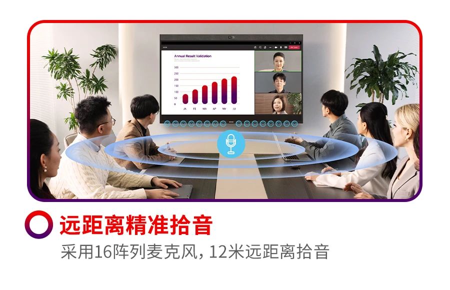 在視頻會議中,用戶經常會遇到聽不清、看不清的痛點。可立享無線會議屏正是針對這些痛點而專門設計的高度集成化產品方案。它集專業的音視頻能力、顯示效果與BYOM于一體。搭載16陣列波束成形麥克風,12米遠距離拾音,具有單獨的硬件加速能力,以AI深度神經網絡算法加持,輕松應對遠距離拾音、噪聲、回聲、混響等聲學挑戰。使遠距離溝通如同面對面,即使在復雜的聲學環境也能從容應對。