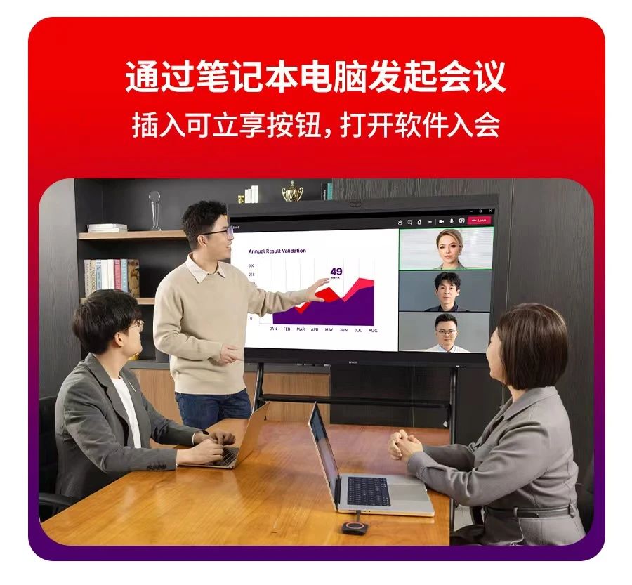 筆記本電腦插入可立享按鈕,打開軟件入會,簡單2步就可以開啟視頻會議。兼容主流云視頻會議平臺,自動調用無線會議屏音視頻,保障高品質會議效果。