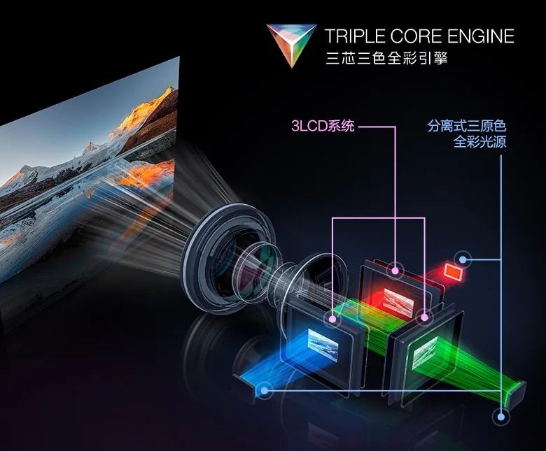 在家用領域,愛普生基于多年來在3LCD技術領域的深厚積淀,創新推出“Triple Core Engine三芯三色全彩引擎”投影技術,突破性的采用愛普生全新設計的“三芯片+三色光源”光學結構,通過精準控光、光能循環和結構優化三大核心升級,將光的利用率推向全新高度,使畫面呈現出亮彩平衡、色域一致、明暗均衡的理想效果,重新定義了投影畫質新標準。