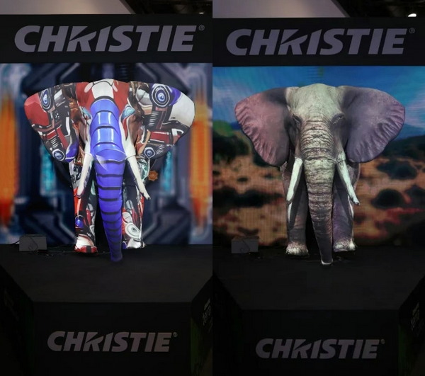 今年 InfoComm China 展的科視展位上,一頭真實比例的機械巨象成了全場焦點。它前腿踏節抬起,象鼻隨光影擺動,頭部微轉似在思索,體表流轉著花卉紋樣,引得觀眾紛紛拍照記錄。