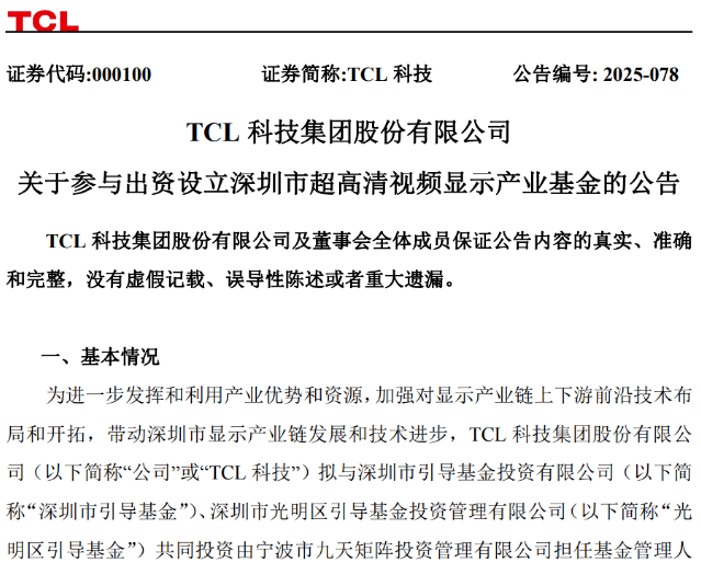 8月29日晚,TCL科技發布公告,公司擬與深圳市引導基金投資有限公司及深圳市光明區引導基金投資管理有限公司共同投資設立深圳市超高清視頻顯示產業私募股權投資基金。