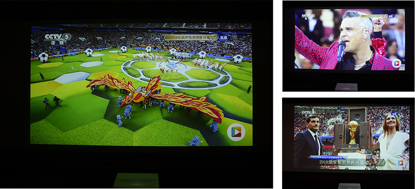 在實際測試中,通過顏色艷麗的圖片,進行開燈和關燈測試。從上面實拍對比圖來看,三原色超短焦激光投影機在開燈環境下,對機子投影畫面影響較小,畫質清晰度能保證正常觀看;關燈實拍效果圖顯示效果無疑比開燈更清晰,白天可以正常觀影,夜晚觀影效果無疑更好呦。